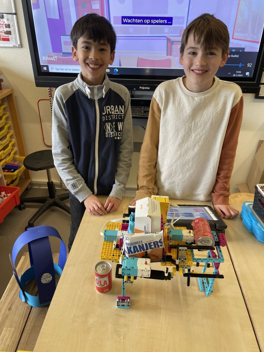 Jesse (10, 7e leerjaar) en Levi (12, ook in het 7e leerjaar) zijn twee jongens uit Wendels stamgroep. Zij hebben onder andere het project met lego gedaan, waarbij je én ontwerpen maakte in technische lego én leerde programmeren om je machine op afstand te kunnen bedienen. “We gaan binnenkort naar een nieuw schoolgebouw en Wendel verzon voor ons de opdracht om voor die nieuwe school een snackautomaat te bouwen”, begint Jesse.