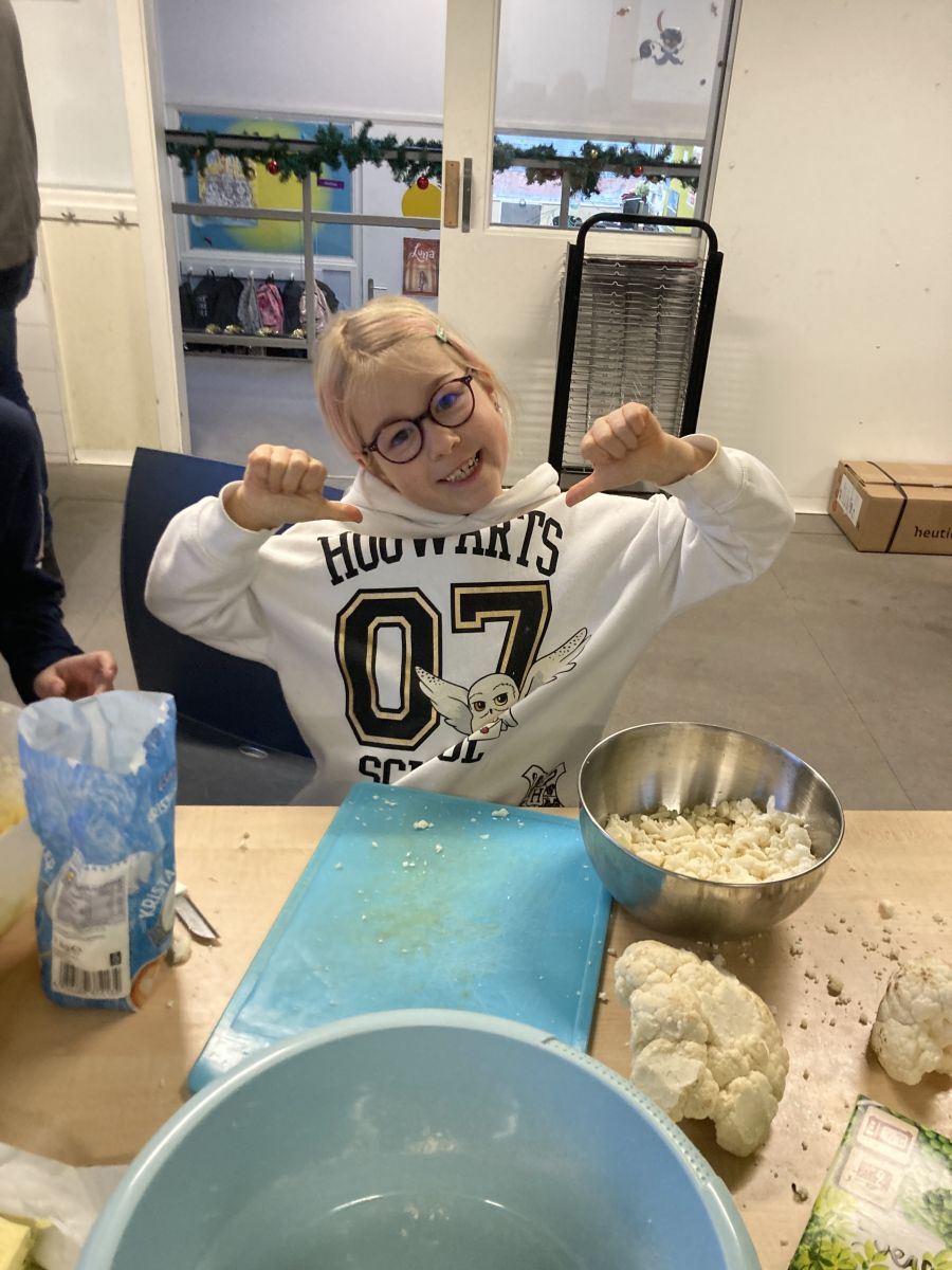 In een lokaal aan de lage kant van de gang is het rustig. De middenbouwgroep is net vertrokken naar de gym, onderin het gebouw. Sep (7, 4e leerjaar) en Annelie (8, 4e leerjaar) doen mee aan De Evenaar en willen wel even blijven om iets te vertellen. Annelie: “Bij De Evenaar waren vijf onderwerpen en we mochten er twee doen. Eentje kies je zelf en de andere kiest de juf voor je.” Sep: “Allebei hebben we 3D-ontwerpen gedaan. Lego en programmeren had ik zelf gekozen en 3D had de juf voor mij gekozen. Jij hebt ook 3D gedaan.” Annelie: “Ja, dat wilde ik zelf. De juf koos koken en proeven voor mij.”