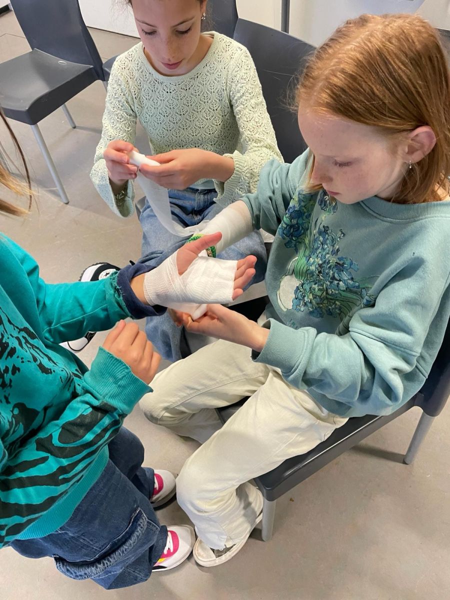 Phileine heeft een fikse wond aan haar been en Kiki legt een snelverband aan. “Ja, goed”, begeleidt Lida de bezigheden. Het verband wordt gezwachteld, steeds met een keurige 2/3 overlap met de vorige laag. “En nu de boven- en onderkant goed vouwen, zodat er geen vuil in kan, weet je nog? Zorg dat het niet te los zit, maar ook niet te strak.” Kiki rommelt een beetje met de twee losse kleefstrips, maar dan zit alles op z’n plek.