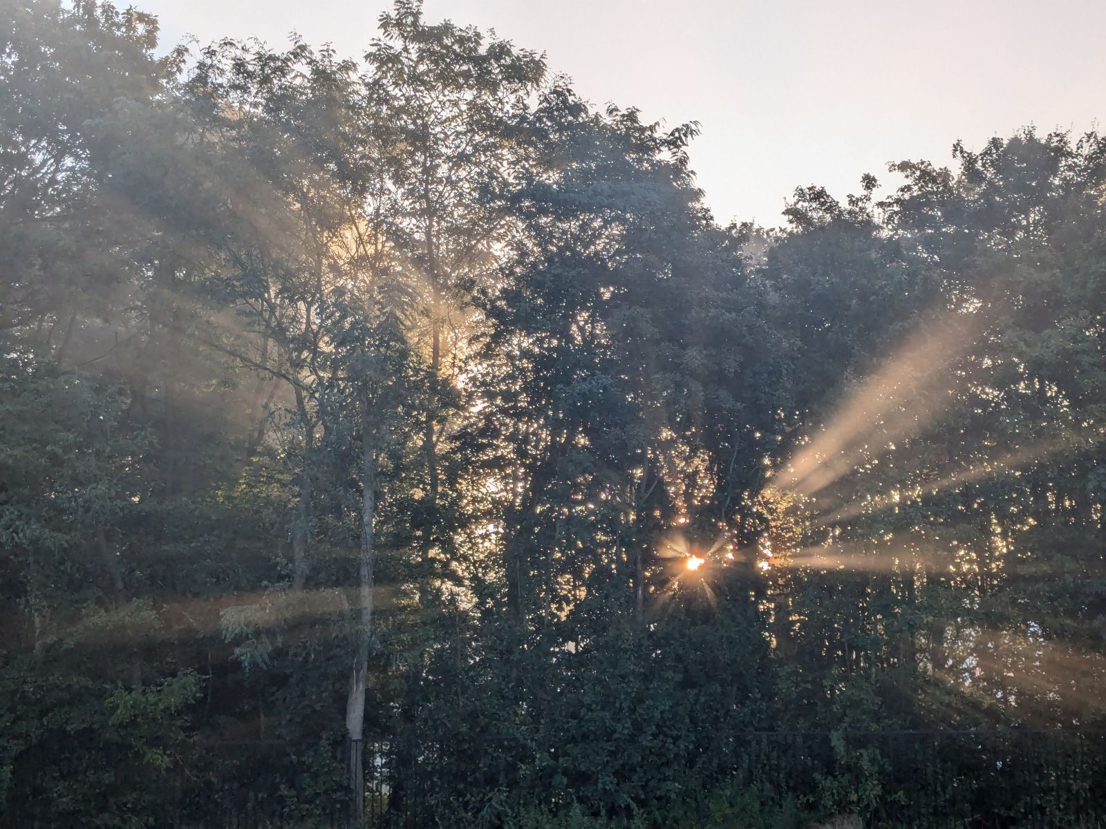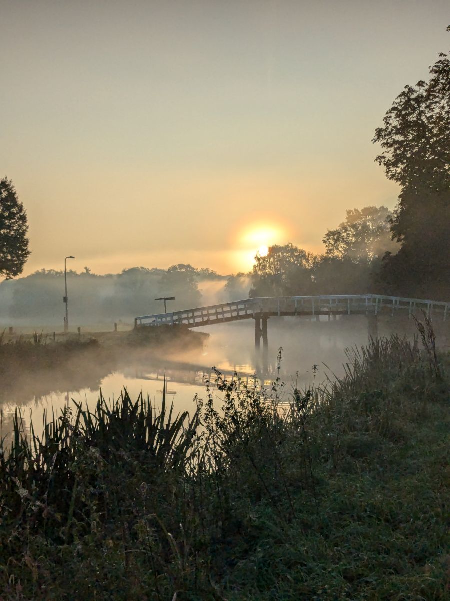 Als ik eenmaal het donkere novemberbos uit ben, fiets ik de dijk op. Ik rij naar het zuid-westen en heb prachtig uitzicht over de Maas en over de dorpen en het platteland. Ver naar links – over de Limburgse grens, boven het diepe donker van het Duitse Reichwald – lijkt het of de wolken met een krullerige penseelzwaai naar beneden zijn uitgeveegd. Daarachter wordt het eerste felgele schijnsel van de zon zichtbaar, terwijl verder naar voren de hemel rood kleurt. Een zwart wolkendek erboven maakt het rood alleen maar intenser. Te midden van dit kosmische schouwspel mag ik hier fietsen, op weg naar mijn school.