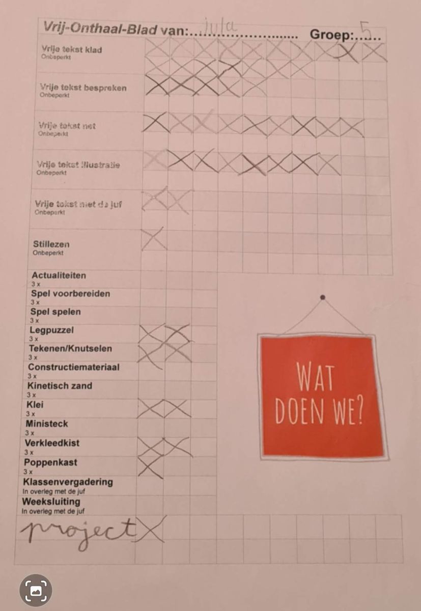 “Nee, onder de individuele bewegingsruimte van het Vrij Onthaal ligt wel een bewuste structuur die ik als stamgroepleider ingericht heb. De kinderen plannen op dinsdag wat ze op woensdagochtend gaan doen. Ook houden ze zelf een kleine registratie bij, zodat ze niet altijd hetzelfde kiezen. In deze registratie zit tevens een vrije-tekst-moment verwerkt, waardoor kinderen juist door Vrij Onthaal ook meer vanuit hun eigen beleving en motivatie met vrije teksten aan de slag gaan. Dat is een leuke bijkomstigheid. Het gaat er mij om het ochtendmoment zo in te richten dat kinderen ruimte voor ontmoeting en voor het bezig gaan met heel diverse activiteiten ervaren.”