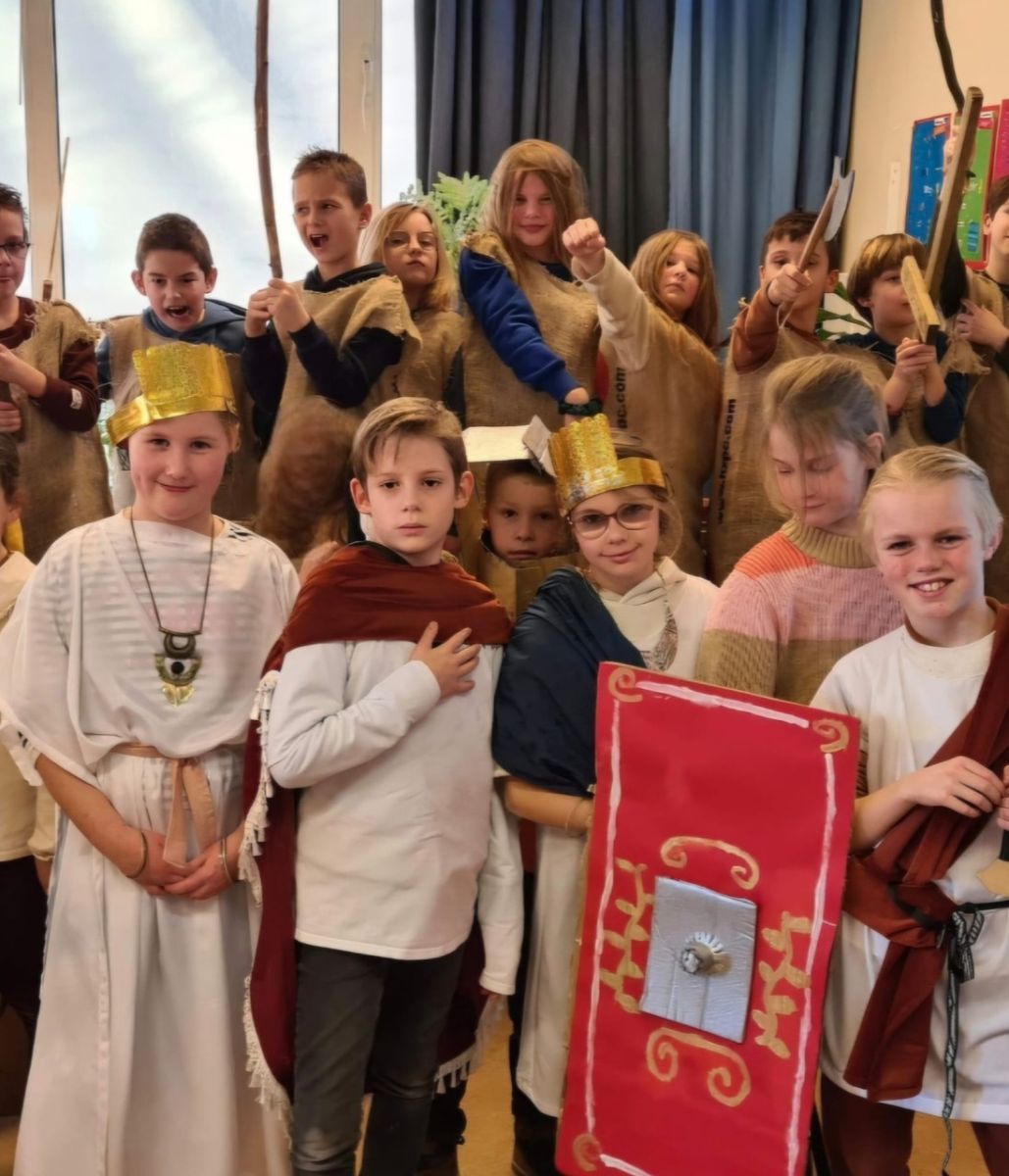 “Historisch denken en redeneren leent zich goed voor verhalend ontwerp en voor spel. We hadden een project over de Romeinen en de Bataven. Zoiets kan heel erg ‘hoofdelijk’ blijven: een historisch kennisproject over wanneer de Romeinen en Bataven er waren, wat ze deden, hoe ze zich tot elkaar verhielden. Maar wij hebben het gekoppeld aan de viering en hebben de Bataafse Opstand uitgespeeld op het podium. De kinderen vonden het fantastisch om zich in te leven als Romein of als Bataaf. De kleding voor de Romeinen werd genaaid door mijn creatieve duopartner; voor de Bataven verknipten we jute zakken, die een jongen uit een gezin met een aardappelbedrijf mee kon nemen. Dat gaf het project een heel ander gevoel: je inleven helpt kinderen te begrijpen hoe het was. Hoe Bataven en Romeinen leefden, verschilde veel van elkaar. Op het gebied van technologie waren ze bijvoorbeeld op een heel ander punt. Toch gingen ze aan het begin van hun contact samenwerken en verwierven de Bataven een reputatie als dappere strijders in Romeinse krijgsdienst, maar later ontstond er onmin tussen beide volkeren, wat uitmondde in de Bataafse Opstand. Zo blijft een bijna tweeduizend jaar oude geschiedenis geen serie feitjes die gestold zijn in lang vervlogen tijden, maar wordt het weer iets levends – iets dat mede vormgegeven heeft aan wat Nederland geworden is.”