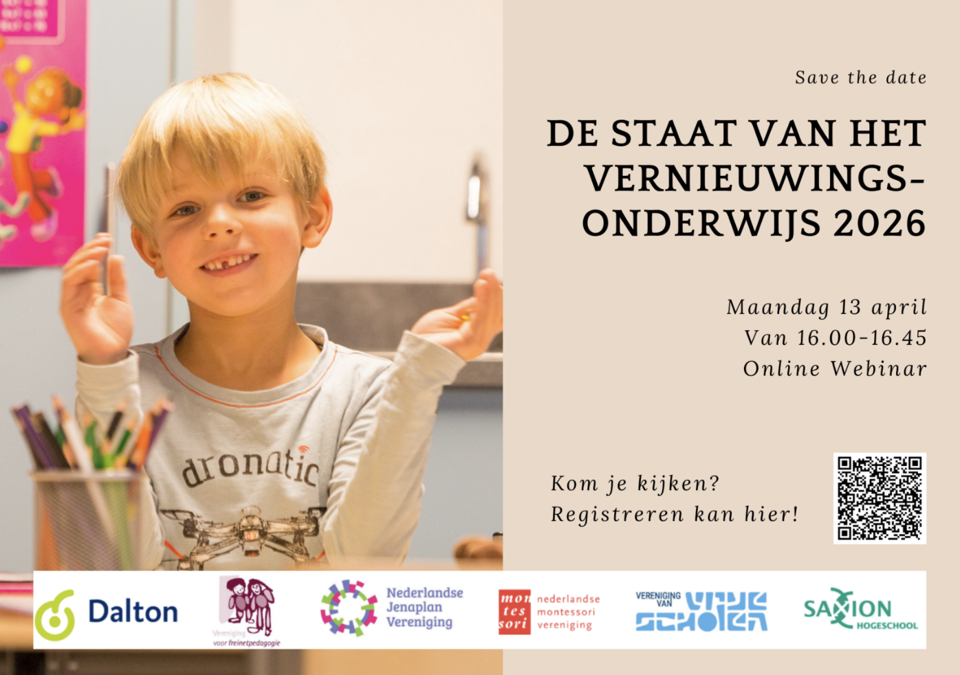 Dit verhaal vormt een opmaat naar het verschijnen van ‘De Staat van het Vernieuwingsonderwijs 2026’ met als thema ‘vertragen in tijden van effectiviteit en efficiëntie’. Dit nieuwe rapport van Saxion en de traditionele vernieuwers van montessori, dalton, freinet, vrijeschool en jenaplan verschijnt op maandag 13 april. Je kunt je – via deze link – nog opgeven om bij de online lancering te zijn. Daarna is De Staat te downloaden. Mensenkinderen komt over een paar weken met een bespreking.